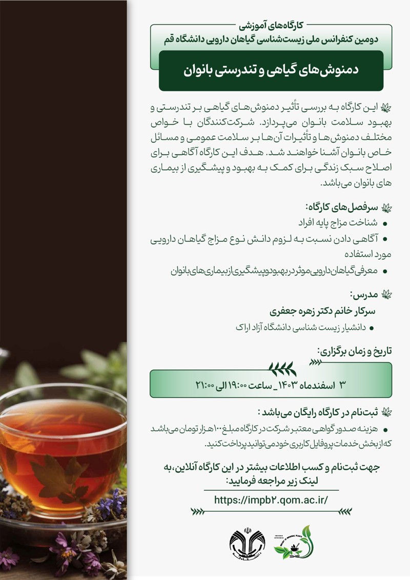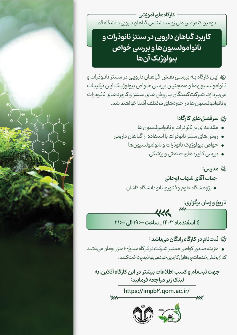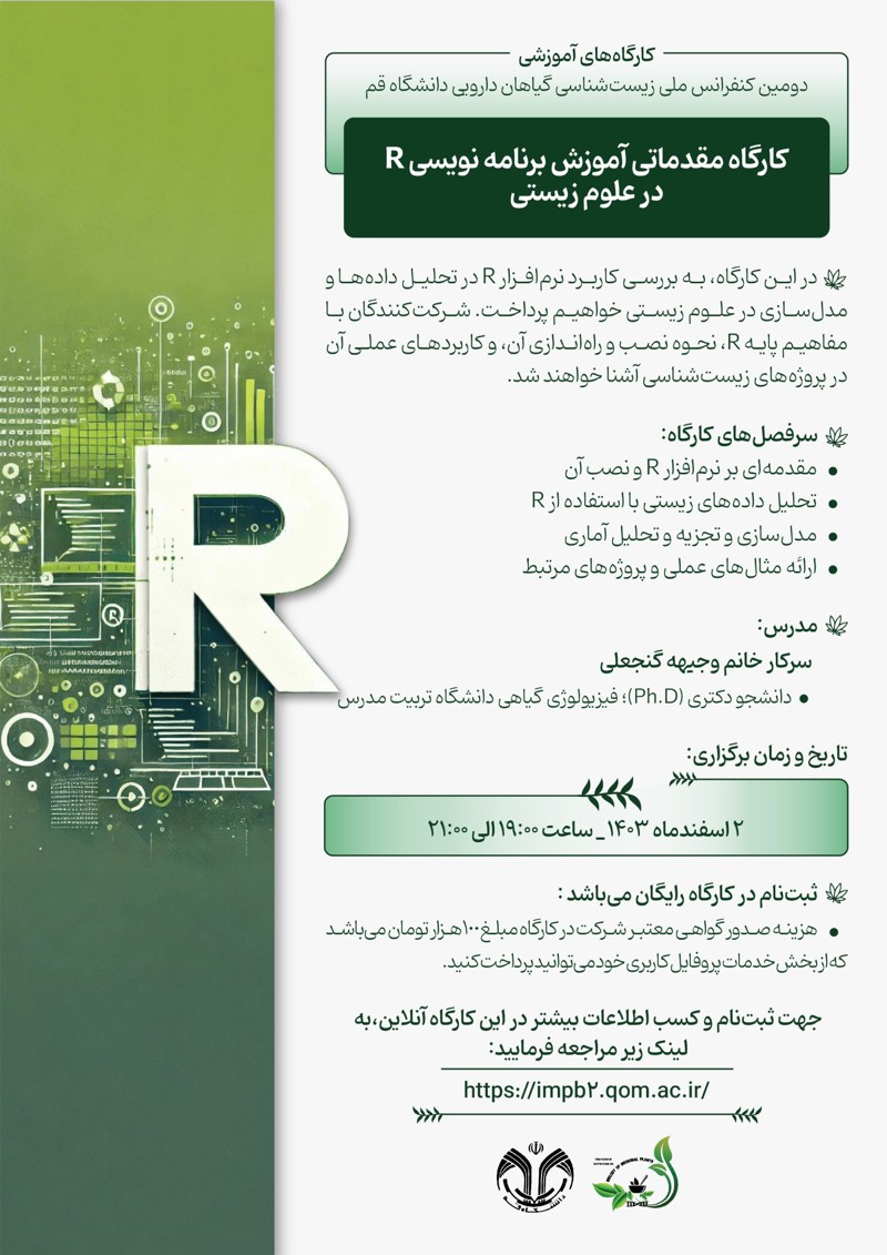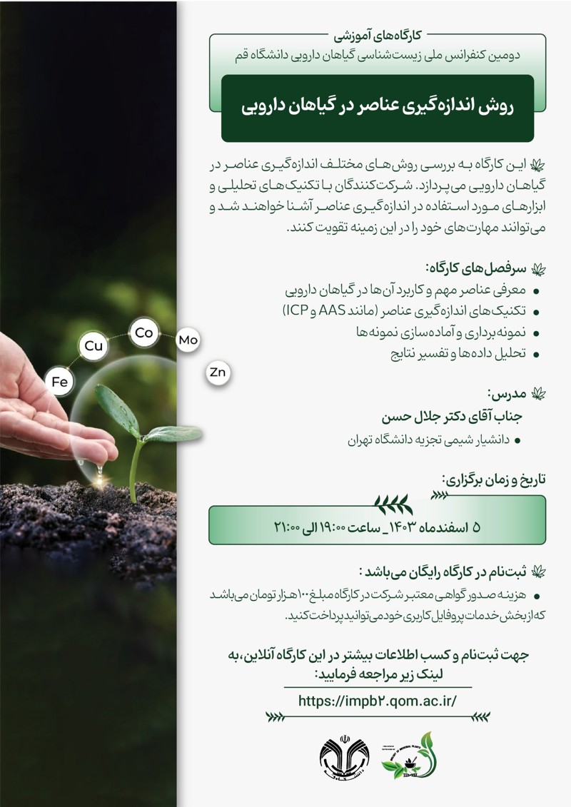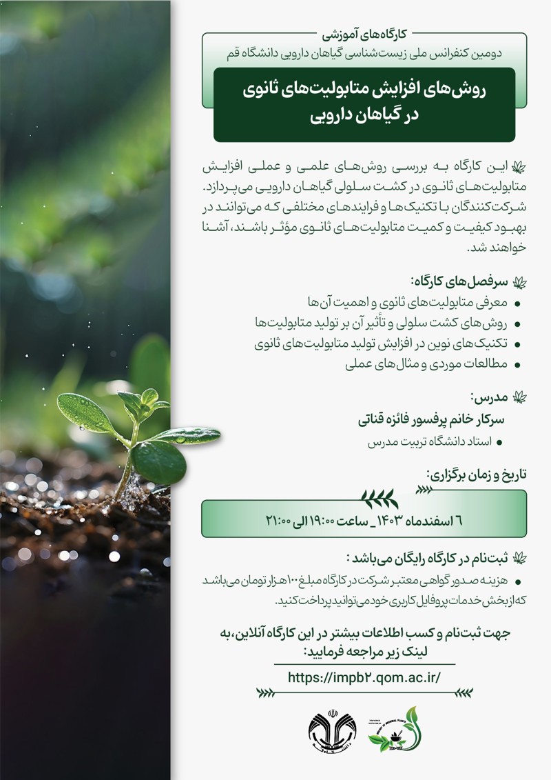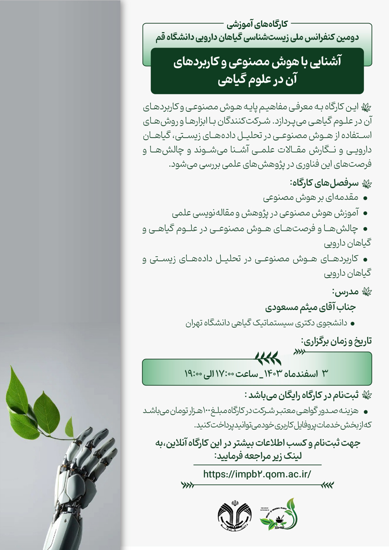 به اطلاع علاقهمندان میرساند که در حاشیه دومین کنفرانس ملی زیستشناسی گیاهان دارویی، که در تاریخ 8 و 9 اسفندماه 1403در دانشگاه قم برگزار میشود، کارگاه آموزشی ویژه بهصورت مجازی برگزار خواهد شد. این کارگاهها با هدف ارتقاء دانش و مهارتهای علمی شرکتکنندگان در زمینههای مختلف زیستشناسی گیاهان دارویی طراحی شدهاند.